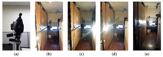 Configuration of data acquisition by a thermal camera and a visual camera, and different lighting conditions of the environmental configurations. (a) Configuration of data acquisition by a thermal camera and a visual camera; and the different environments of (b) back; (c) left; (d) right; and (e) front side lightings.