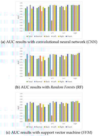 Area under the curve (AUC) comparison in various lighting conditions using (a) CNN; (b) RF; and (c) SVM.