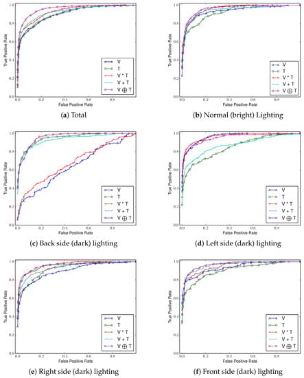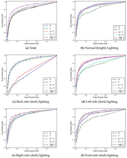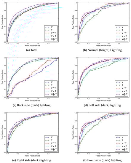 We use AUC and ROC curves for performance comparison as shown in Figure 10, Figure 11, Figure 12 and Figure 13. Considering the overall performance comparison, our proposed joint filter-based gesture recognition performs stably in the presence of varying lighting conditions compared to other methods (i.e., single visual image-based, single thermal image-based, multiplication-based, and addition-based methods). The darkest condition of back side lighting decisively influences the single visual image-based method and the multiplication-based fusion method. Another dark condition of left or right side lighting has a negative effect on the single thermal image-based method and the addition-based method. The results with all conditions (total) show that our proposed joint filter-based gesture recognition outperforms the other methods.