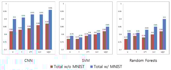 In order to look into the influence of the comprehensive MNIST database, we repeat the previous experiments with exclusion of the MNIST learning data. As shown in Figure 14, the classification performances drastically decrease when using CNN, as a Neural Network-based classifier highly depends on data. On the other hand, SVM is based on particular data which correspond to support vectors, and the exclusion of the MNIST database has relatively less of an effect on the classification performance of SVM. Random Forests was influenced more than SVM by the learning data configuration. Accordingly, the large quantity of the MNIST database provides an improvement in the classification performance.