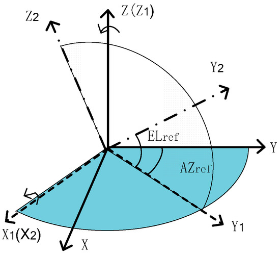 The axis rotates the angle of AZ around the opposite direction of the axis in reference frame , building an intermediate coordinate system . The axis rotates the angle of EL around the axis in frame , forming a new frame as shown in Figure 1. The axis of should be the axis of starlight. The star vector in can be written as:
