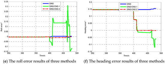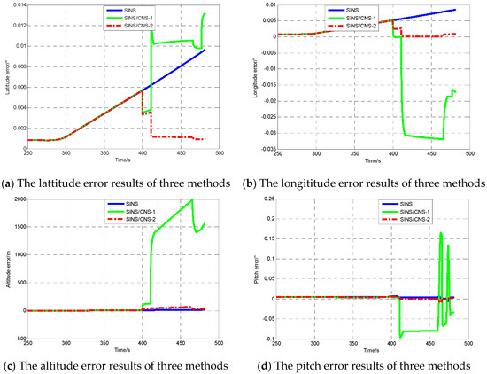 The previous conclusion showed a remarkable efficiency in the estimation of the installation errors. In order to verify that the accuracy of SINS/CNS can be clearly increased, it is necessary to undertake simulations under three conditions, namely: SINS, SINS/CNS integration method without considering star sensor installation errors (SINS/CNS-1), SINS/CNS integration method considering star sensor installation errors (SINS/CNS-2).