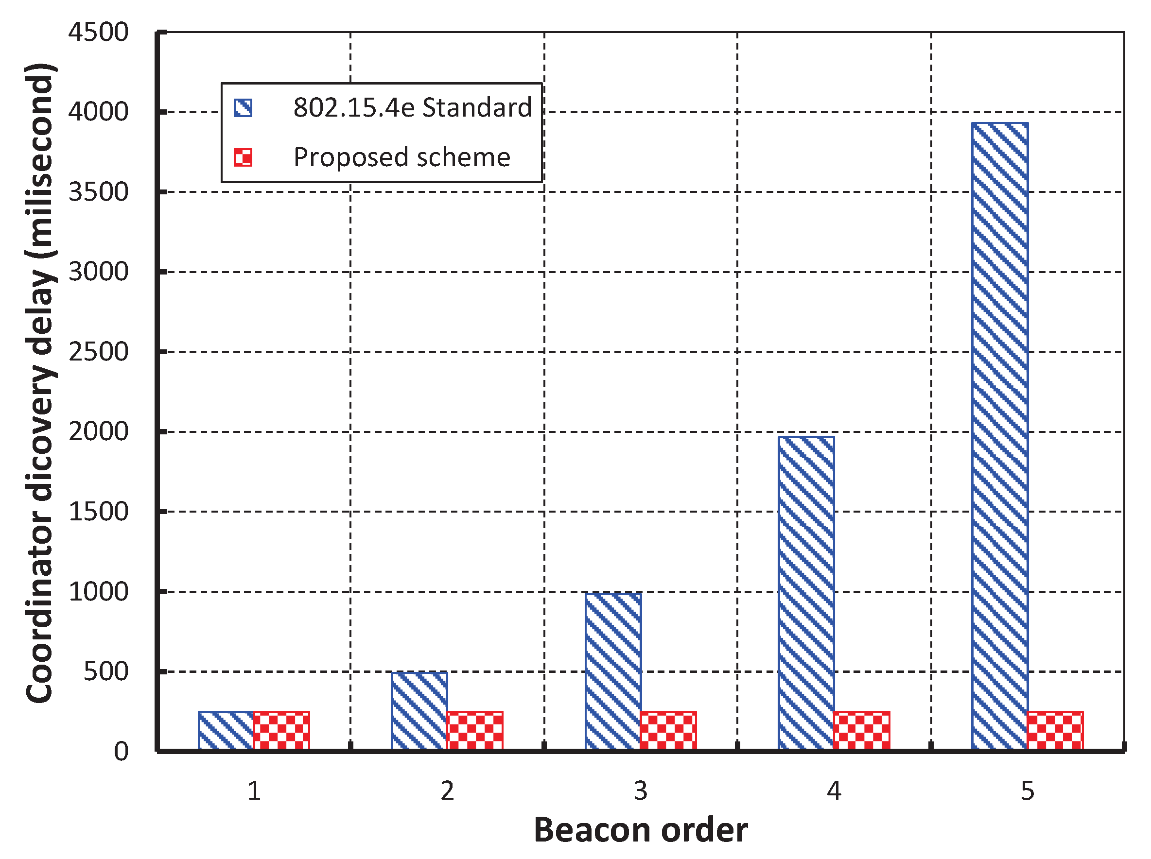 Figure 15, we compare our scheme with IEEE 802.15.4e standard taking beacon order from 1 through 5 and superframe order as 1. It is found that coordinator discovery delay of our scheme remains constant though it exponentially increases in case of IEEE 802.15.4e. This happens as the coordinator broadcasts the beacon sequentially in every channel in our proposed scheme.