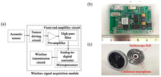 (a) Block diagram and (b) photograph of proposed wireless breathing sound acquisition module and (c) photograph of acoustic sensor.