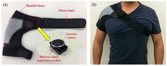 Figure 3a,b shows the photograph of the wearable mechanical design and photograph of wearing the wireless breathing sound monitoring system during experiments, and it mainly consists of a shoulder brace, an elastic band and an area of Velcro. The structure of the shoulder brace is used to embed the proposed wireless breathing sound acquisition module and also support the weight of this module. Moreover, by adjusting the tightness of elastic band, the proposed module can easily fit the chest contour of the user to maintain a good contacting condition between the acoustic sensor and the chest surface to reduce the artificial influence of motion. In this wearable mechanical design, the area of Velcro is used to fix the proposed module on the shoulder brace so that the proposed system can be easy to wear and use in daily life.