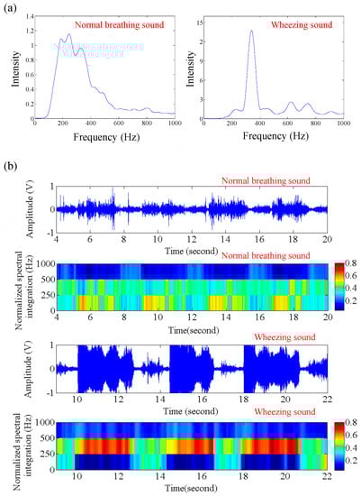 (a) Spectrum of wheezing and healthy breathing sounds, and (b) raw data and feature patterns for wheezing and healthy breathing sounds.