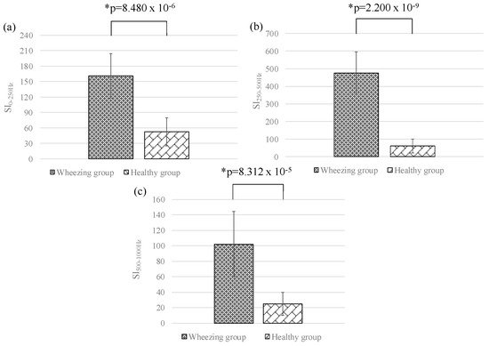 Means and standard deviations of (a) SI0Hz-250Hz; (b) SI250Hz-500Hz; and (c) SI500Hz-1000Hz for different groups. Here, * denotes significant difference.