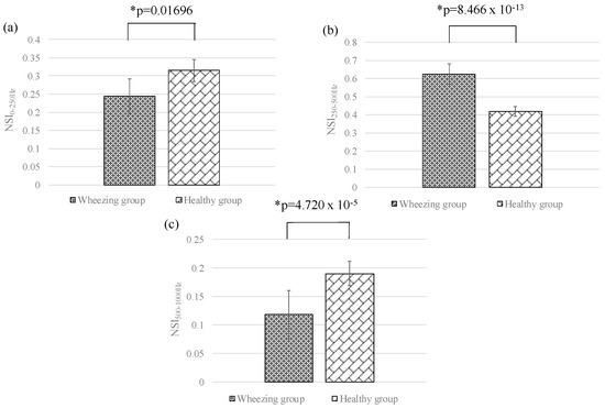 Means and standard deviations of (a) NSI0Hz-250Hz; (b) NSI250Hz-500Hz; and (c) NSI500Hz-1000Hz for different groups. Here, * denotes significant difference.