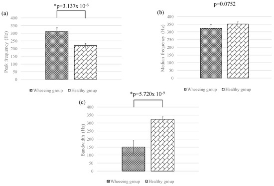 Means and standard deviations of (a) peak frequencies; (b) median frequencies; and (c) bandwidths for different groups. Here, * denotes significant difference.