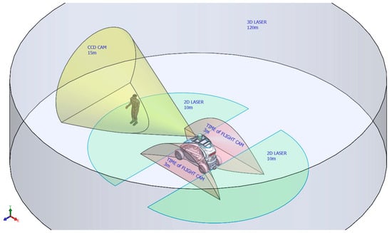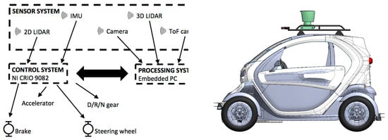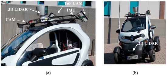 Short-range sensors. The car carries two TIM55x Laser scanners (Sick, Waldkirch, Germany, see Figure 3b), one on the front of the vehicle and one on the back, parallel to the ground and at a height of 30 cm. Each laser covers 180° with an angular resolution of 1°, has a scanning range of 0.05 to 25 m with a systematic error of ±60 mm, and spins at 15 Hz. The lasers are connected to the central control system through an Ethernet connection. The vehicle also carries two SENTIS3D-M420 time-of-flight cameras (BlueTechnix, Wien, Austria) one on each side of the vehicle (see Figure 3a). Their purpose is to gather data from the closest surroundings, which are too close for the 3D LIDAR. The effective operating distance is limited to approximately 4 m. Each camera captures up to 160 images per second, with 160 × 120 pixels resolution, independently of the outside lighting conditions.