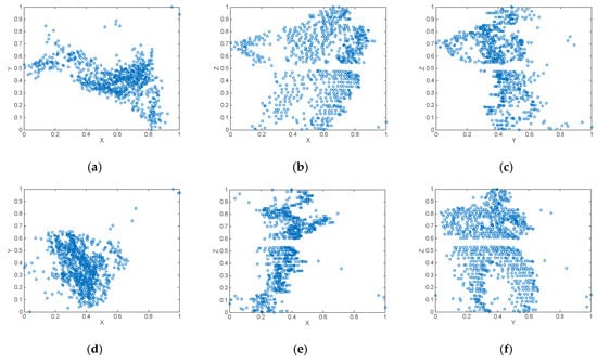 Normalized XY, XZ and YZ axonometric projections of two pedestrian samples: (a–c) pedestrian one; (d–f) pedestrian two. By applying different coefficients to the normalized data, while keeping the aforementioned proportions, we can generate several binary images. But these images are only composed of dots (the points where a laser beam hit an object), see Figure 8a–f.