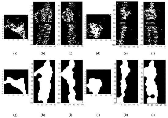 The values we select for all operations are strongly related: if the images we generate are big, the processing algorithms have to be very aggressive to generate compact images. But if the images are small, we can lose information in the generation of the binary images. We empirically obtained the following values. X and Y axes have been mapped to 50 pixels, while the Z axis has been mapped to 100 pixels. These rates avoid the apparition of holes in the images and reduces the pre-processing. We used the ‘ceil’ operation to round values, since the image’s pixels start at value ‘1’. The opening operation was configured to use a radius of six pixels, the filter erases particles with areas of less than 200 pixels, and the closing operation was configured to use a ratio of three pixels. Figure 8a–f shows the binary images obtained from the samples are shown in Figure 7, while Figure 8g–l shows the results of the pre-processing stage with these values.