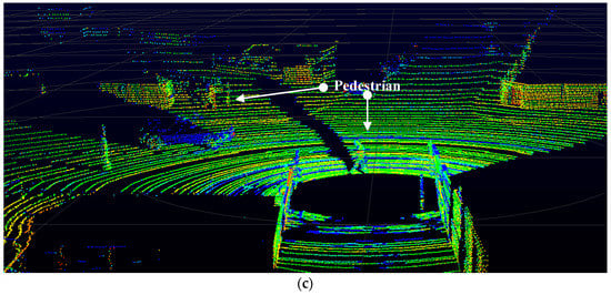 Three scene frames: (a) Intelligent Vehicles and Computer Vision Lab; (b) underground parking; (c) Real traffic scene. The colour of the points in the images represents the reflexivity value reported by the 3D LIDAR.