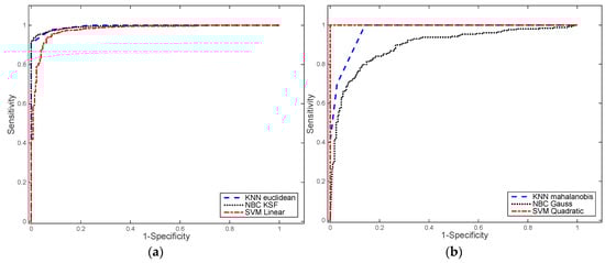 ROC results: (a) kNN classifier with Euclidean distance, NBC with KSF, and SVM classifier with linear functions; (b) kNN classifier with Mahalanobis distance, NBC with Gauss kernel, and SVM classifier with quadratic polynomial function.