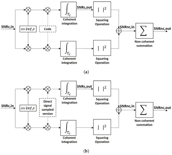 The analysis of the correlation peak statistics has been widely explored in the GNSS literature [,,,,]. The fundamental operation in a GNSS signal acquisition system is the cross-correlation of the digitized received signal with a clean replica of the satellite code (matched filter) in order to obtain the so-called waveform, see Equation (1), which is the same computational operation that is performed in a conventional GNSS-R receiver. This computation is also known as coherent integration, and it can last up to 20 ms, which is the duration of a navigation bit. Longer coherent integration times can be always applied after compensating for the navigation bit sign change. After coherent integration, non-coherent integration is performed, which consists of summing the waveforms obtained in power units to improve the visibility or detectability of the satellite presence. Non-coherent integration requires a squaring operation which changes the statistics of the obtained samples, and therefore, leads to a redefinition of the resulting SNR. Figure 1a shows a typical block diagram of a coherent or I/Q detector. It is possible to introduce four different definitions of the SNR, but they correspond, in fact, to two. The first one is the , which is the SNR before correlation with the clean replica of the satellite code, or pre-correlation SNR. It is always negative since GNSS signals are below the noise level, unless a very high directivity antenna is used to acquire them. The second one is the , which is the SNR after correlation with the clean replica of the satellite code. It is related to the by the signal’s bandwidth times the coherent integration time. Basically, the thermal noise bandwidth is reduced in the coherent integration process, letting the signal rise above the new thermal noise level. The third one is the , which is the SNR resulting from a non-coherent detection scheme where no phase information is available. The is related to the by the squaring-loss parameter []. The last one is the , which is the SNR after the non-coherent integration/averaging.