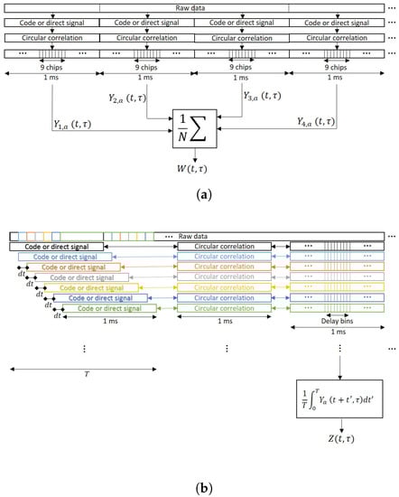 The main differences between Equations (25) and (26) are depicted in Figure 2. While for Equation (25) the blocks of data for the incoherent averaging are taken separately without overlapping, for Equation (26) there is a moving window of 1 ms length and the waveforms are obtained using some overlapped samples. Note that in order to have all the waveforms aligned, i.e., to have the maximum correlation peak at the same lag, the clean C/A code block against whom the signal is correlated to must be circularly shifted. If 1 ms waveforms are highly correlated, the use of partially overlapped data data will not provide any improvement because the addition is made with data whose correlation coefficient is nearly 1.
