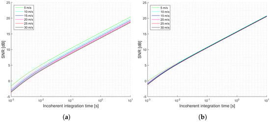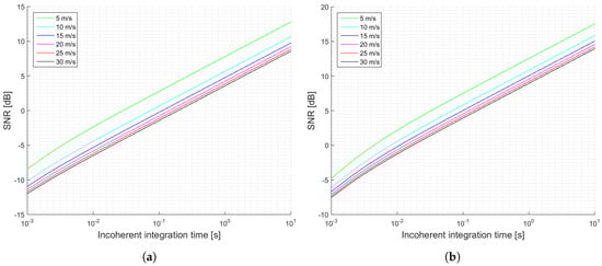 Simulations SNR for the GEROS-ISS scenario and cGNSS-R: (a) Minimum received power on ground of −158.5 dBW; (b) Minimum received power on ground of −153 dBW. Legend indicates u wind speed.