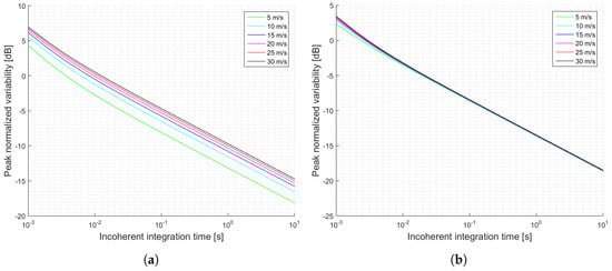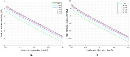 Simulations of the normalized peak variability for the GEROS-ISS scenario and cGNSS-R: (a) Minimum received power on ground of −158.5 dBW; (b) Minimum received power on ground of −153 dBW. Legend indicates u wind speed.
