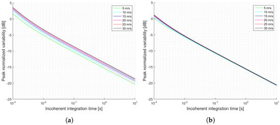 Simulations of the normalized peak variability for the TDS-1 scenario and cGNSS-R: (a) Minimum received power on ground of −158.5 dBW; (b) Minimum received power on ground of −153 dBW. Legend indicates u wind speed.