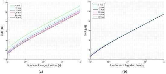 The analysis of the SNR is very important to determine the variance of the radar cross section or reflectivity, and therefore, to assess the system’s capability and accuracy to measure geophysical parameters. The accuracy of radar scatterometric measurements from space was first addressed in [], where two different effects were analyzed: the bias due to a lack of precise knowledge of the exact value of the system’s parameters, and the random fluctuations of the measured signal. While the bias can be compensated for through appropriate instrument calibration, the random fluctuations of the signal (speckle noise []) can only be reduced by averaging. In [], it was considered that both the signal and the system noise follow Gaussian statistics, that is, the received signal is purely incoherent.