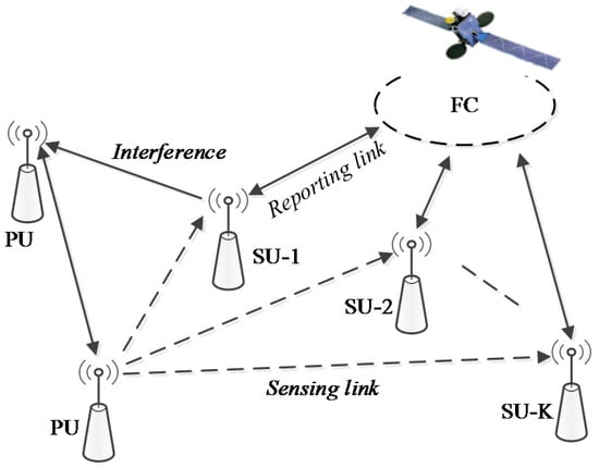 It is observed from the scenarios described in [12,13] that satellites can be provided on a secondary basis, and the primary services can be either terrestrial or satellite-based. The architecture and system model of CSS for LEO mobile satellite services is established as depicted in Figure 1. We consider the CR network consisted of K SUs (i.e., earth stations or sensors) and one LEO satellite (i.e., FC), which are taken as secondary system. Besides, the primary system is composed of PU licensed in the incumbent satellite services or terrestrial networks operating in the same spectrum, such as 3G mobile telephony, LTE, WiMax and WiFi. We define two types of links that we call sensing link (i.e., from PU to SU) and reporting link (i.e., from SU to FC). In this system model, there are broadly three steps: first, each SU implements local sensing to independently detect the presence or absence of PU via sensing link; second, SU reports the detection result to FC through reporting link; and third, FC combines the results with hard counting fusion rule [35,37] to make a global decision about the state of primary system and then reports back to SU. Only when the primary system is detected to be idle can the SU use the licensed frequency for transmission. Once any of PU activity is found, the secondary system must fleetly vacate the spectrum to avoid interference to PU.