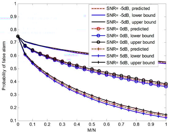 It can be concluded that Equation (12) tells us how much information we lose via compressed samples in terms of our ability to solve our detection problem, precisely. Moreover, it is absolutely feasible to use Equation (15) to predict the probability of false alarm because is so small that the impact on can be neglected with high probability. Although, for a given instance of , the curve of relationship between and compression ratio may be better or worse than the predicted curve by Equation (15).