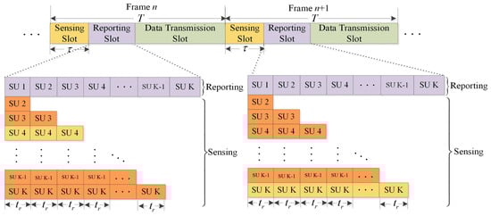 As depicted in Figure 5, the i-th SU reporting time can be utilized for its following SU sensing. In other words, for the i-th SU, the calculated in reporting slot can be employed for local compressed sensing. Hence, the equivalent sensing time of the i-th SU is . For example, the total duration and in the yellow region of Figure 5 denotes the equivalent sensing time of SU 4 and SU , respectively.