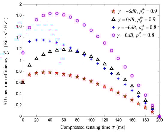 Figure 6 shows SU spectrum utilization efficiency versus the compressed sensing time allocated to each SU. The simulation results validate that SU spectral efficiency is the unimodal convex function with regard to compressed sensing time . There indeed exits one optimal point standing in the curve that maximizes the SU spectral efficiency. We can see that the spectral efficiency increases as increases from 0 to , whereas decreases when is increased further. This is because little sensing time τ degrades sensing performance, while long sensing time τ results in short transmission duration. For a given SNR, decreases with increased targeted detection probability. Particularly, for SNR = −6 dB, the maximal spectrum efficiency is 1.4 Bits·s−1·Hz−1 when target detection probability is 0.8, while it is only 0.8 Bits·s−1·Hz−1 and 0.5 Bits·s−1·Hz−1 when target detection probability is 0.9 and 0.95, respectively, which denotes that SU spectrum utilization decreases with debasement of the interference to PU. It can also be seen that optimal sensing time increases with the increase of SNR values. Taking for example, when SNR = −6 dB, 30 ms to achieve the maximal spectral efficiency; when SNR = 0 dB, 60 ms to achieve the maximal spectral efficiency.