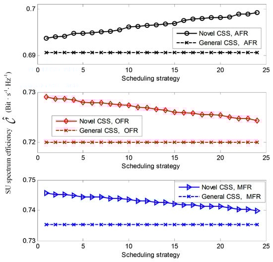In order to achieve a tradeoff between interference to PU and spectral efficiency, the target cooperative detection probability is set to be 0.9. In Figure 7, we plot SU spectral efficiency of the novel CSS with different reporting scheduling strategy, when the optimal sensing time is employed to cases where is fixed at 1 (OFR), is fixed at 2 (MFR), and is fixed at 4 (AFR). The SNR at the i-th SU is set to be {−20 dB, −16 dB, −12 dB, −8 dB}. The first scheduling strategy is the descending sort of received , while the last is the ascending sort of among the total 24 cases of scheduling strategy. From Figure 7, it shows the novel CSS scheme outperforms the general CSS in the frequency reuse. In fact, the spectral efficiency of the novel CSS is closely related to scheduling strategy closely, while it has no effect on the general CSS. The optimal scheduling strategy for AFR is reporting the sensing results in the ascending sort of SNR, and reporting the sensing results in the descending sort of SNR can the unoccupied spectrum been fully utilized for OFR and MFR. This is consistent with the aforementioned theoretical proof.