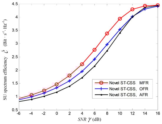 SU spectral efficiency versus for the scheme of Novel ST-CSS and General CSS under decision fusion rules of OFR, MFR and AFR, respectively.