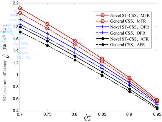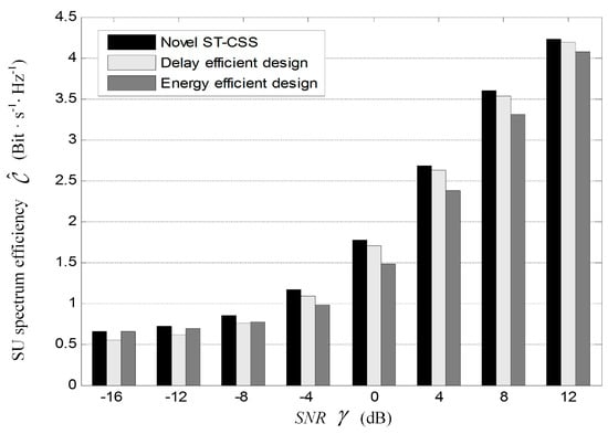 Comparisons of SU spectral efficiency among the schemes of the proposed ST-CSS, the transmission delay efficient design and the energy efficient design.