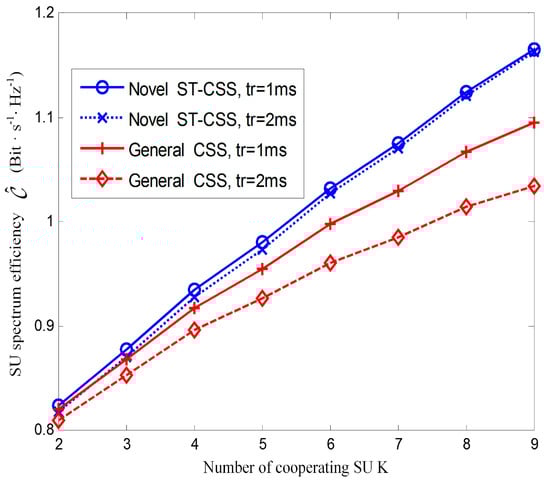 Spectral efficiency versus number of cooperating SU for the novel ST-CSS scheme and the general CSS scheme under different values of reporting time.
