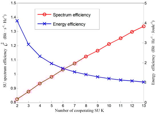 SU spectral efficiency and energy efficiency versus the number of cooperating SU for the novel ST-CSS scheme.