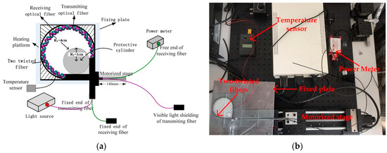 The displacement sensor system is shown in Figure 1. It consists of an LED optical source (LEDD1B, Thorlabs, Newton, NJ, USA), a Power Meter (S120vc, Thorlabs), a fixed plate of the diameter of 8 cm, a guard cylinder with a diameter of 1 cm placed in the plate groove to prevent the bent radius of fibers that are too small to break the sensor when the fiber free end is moving. A temperature sensor monitored the temperature of fiber in real time. A macro-bend structure of two twisted naked plastic optical fibers in the plate groove works as the sensing element which is fixed on the Heating platform (MS-H280-Pro). One end of the two twisted optic fibers is the ‘fixed end’, and the other end, the ‘free end’. The free end of two twisted fibers is fixed on the motorized stage (Y200MC). The fixed end of receiving fiber is covered with a black hat to shield the visible light, and the free end of the fiber is connected to power meter. The fixed end of transmitting fiber is connected to optical source, and the other end is covered with a black hat to shield visible light. The Motorized stage is used to draw the free end of the two twisted fibers to achieve displacement shifts.