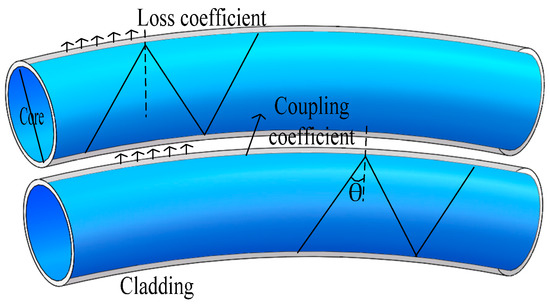 The fiber macro-bend radius is smaller than a certain threshold, which causes optical fiber mode field distortion, so that the light confined in fiber originally radiates outside of the fiber. The outside radiation generates a lot of macro-bend radiation modes and cladding modes, where macro-bend radiation modes mainly come from the refracted light rays and tunneling rays. Transmission coefficients of the refraction effect and the tunneling rays are expressed by Τr and Τt, respectively [13], as
