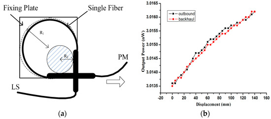 A single-fiber macro-bending structure for a displacement sensing system is shown conceptually in Figure 3a, with one end of the fiber connected to a Light Source (LS) and another end connected to a Power Meter (PM), all parameters are identical with Figure 1 except the light source is laser. The radius of the macro-bend decreases with the displacement increase, the output power changes become disorderly and unsystematic. Because the background noise of the transmitting fiber is mainly composed of core mode fluctuations, influenced by the light source fluctuations, it shows poor signal-to-noise ratio. Especially in the case of using a laser light source, the laser echoes the interference, which results in the laser output power undergoing large fluctuations. To use the LED as a light source is feasible, and the experimental result is shown in Figure 3b, while the change rate of the output power of the fiber end during outbound and backhaul is only 0.02%. So a laser light source is replaced by an LED source in the experiment, and a single fiber macro-bend is not suitable for displacement detection.