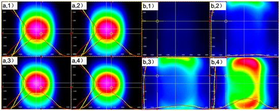 The Beam Quality Analyzer (BC106N-VIS/M, Thorlabs) used for analyzing the energy coupling and distribution of the transmitting fiber and receiving fiber of two twisted optic fibers is also shown in Figure 4. Light intensity at the end of the transmitting fiber and the receiving fiber shown on the Beam Quality Analyzer change with the displacement. Figure 4a shows the light intensity distribution of the transmitting fiber when the displacements are 0 mm, 45 mm, 90 mm and 135 mm.