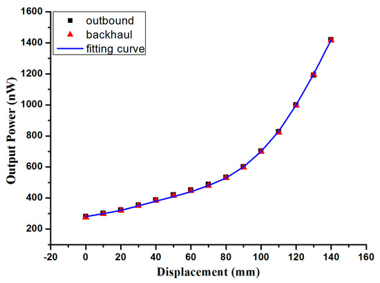 In the experiment, the light source power is set at 39.027 mW. Although the output power of the receiving fiber is only of nW, the resolution of the Power Meter at 1 nW is enough to be detected. The motorized stage is set to draw the free end of two twisted fibers at a constant speed of 2 mm/s, and the power meter linked to the free end of the receiving fiber is used to detect the output power of receiving fiber at the same time. From the result of Figure 5, under the displacement range of 0–140 mm, the output power of the receiving fiber increases gradually, and the output power shift is approximately linear with a displacement of 110 mm–140 mm. The sensitivity is 19.805 nW/mm; accuracy, 0.12 mm resolution, respectively. For the displacement from 140 mm to 0 mm, the output power decreases in real time, while the systematic retrace error is less than 0.05 nW/mm in the experiment. When the fiber end is drawn at different speeds of 2 mm/s, 6 mm/s, 10 mm/s, as shown in Figure 6a, the displacement-output power curve shows a slight overall decline.