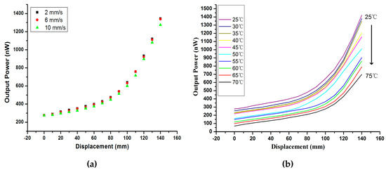Temperature is an important factor in the external environment for displacement application. As the normal operating temperature of plastic optical fiber increases up to 70 °C, the sensor is affected by temperature (from 25 °C to 70 °C) as shown in Figure 6b. With an increase of the temperature, the displacement-output power curve shows an overall decline, and the sensitivity is also decreased. Because of the rising temperature, the light performance of the plastic optical fiber gets worse, and the coupling capacity between the two twisted fibers is reduced. From the experimental results above, this system is used with displacement sensors during this development effort within a stable structure.