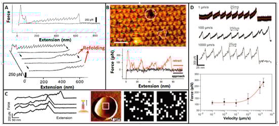 Besides directly visualizing the topography structures of single proteins, AFM can also mechanically reveal the dynamic information in the unfolding process of single protein. Protein molecules acquire their functions by specifically folding their polypeptide chains into well-defined three dimensional structures, and thus the unfolding information becomes a “molecular fingerprint” for indicating the proteins [65]. In 1997, Rief et al. [66] firstly used AFM to mechanically unfold single titin molecules, as shown in Figure 3A. Titins were allowed to adsorb onto gold surface in phosphate buffered saline (PBS) solution. The force extension curves evidently exhibited a sawtooth-like pattern, with a periodicity that varied between 25 and 28 nm. Force extension curves of the same titin molecule were recorded to examine the refolding of titin. After each extension, the molecule was allowed to relax completely. A completely cycle took approximately 1 s. The subsequently recorded force extension curves also exhibited sawtooth-like peaks, but the peaks were fewer. The results showed that titin refolded but only a fraction of the domains refolded. During the process of unfolding a molecule, it was possible that the molecule was fully unfolded but did not detach from the cantilever tip. Tension on the protein might then be relaxed by returning the tip to the position before unfolding [67]. In this case, the domains of the protein might actually refold, allowing the protein to undergo forced unfolding again. The research demonstrate that AFM could investigate the unfolding and refolding process of single proteins.