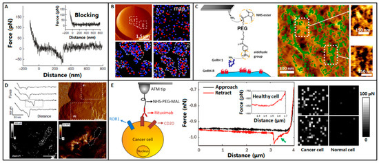 Using AFM to specifically probe the target molecules on the surface is an important and successful application of AFM in single-molecule assay. In 1994, Florin et al. [72] firstly used AFM to measure the unbinding force of individual molecular pair (biotin-avidin), as shown in Figure 4A. AFM tip was firstly coated by a layer of biotinylated bovine serum albumin (BSA) and then incubated with avidin molecules. The AFM tip was moved to biotinylated agarose beads to obtain force curves. The obtained force curves clearly showed the adhesion peaks caused by the rupture of biotin-avidin pair. After adding the avidins to block the biotins on the beads, there were no adhesion peaks in the obtained force curves, demonstrating the specific biotin-avidin binding during force spectroscopy. But the adhesion peaks in the obtained force curves contained as many as 100 biotin-avidin pairs. By blocking most of the biotin on the beads, the number of interacting molecules were significantly reduced and the single binding events were measured.