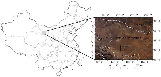 A site approximately of 30 km × 30 km located within the Badain Jaran Desert is adopted. It locates in central Inner Mongolia of Northern China (Figure 1). The site is selected for the following three reasons [,]: First, the area is temporally, spatially and radiationally stable in brightness, spatial homogeneity, altimetric and bidirectional effects, seasonal variation, and long-term stability []. Second, sand is the primary surface material in this area, provides a high-reflectance surface. Third, the site has a typical continental arid climate, and the atmosphere is always dry and clean (low aerosol).
