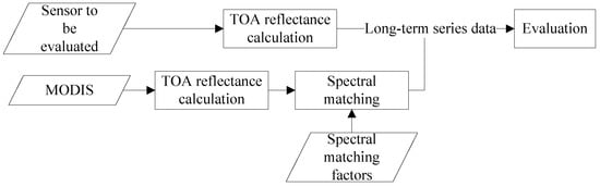 The procedure in this paper for evaluating radiometric capability of Chinese optical satellite sensors using MODIS is shown in Figure 2 and it includes three parts: (1) calculating the TOA reflectance; (2) spectral matching to eliminate the influence of different spectral response; (3) evaluating the radiometric capability of the sensors using the long-term series TOA reflectance between sensors and MODIS after spectral matching.