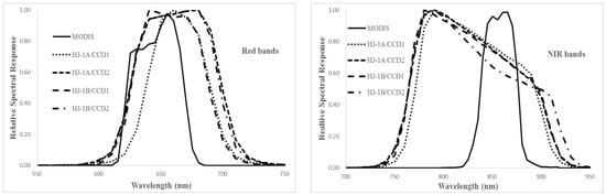 The relative spectral responses of the CCDs and MODIS in VNIR bands.