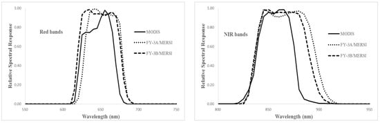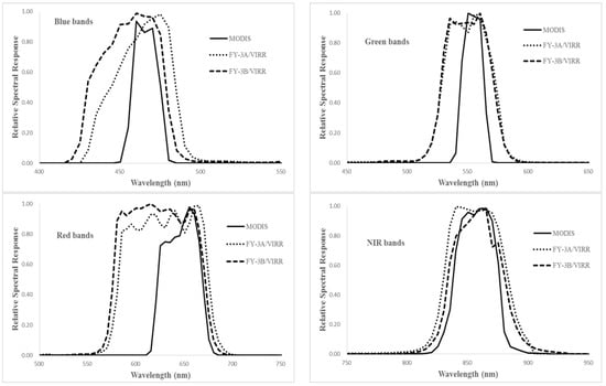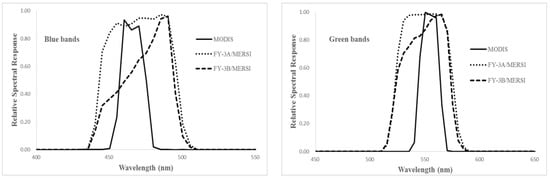 The relative spectral responses of the MERSIs and MODISs in VNIR bands.
