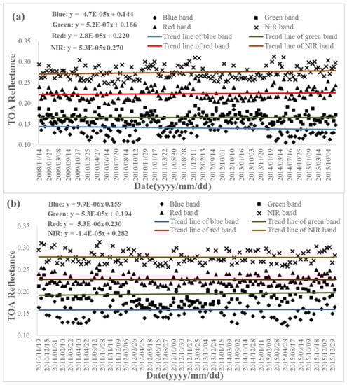 Although several factors can induce the variation of the TOA reflectance, the long-term tendency of the TOA reflectance remains consistent and the slope values of the fitted lines for different bands range from 10−7 to 10−5, which indicates a very small variation trending. The intercepts of the fitted lines are close to the corresponding means of TOA reflectance. The standard deviations of the TOA reflectance are within 0.02. All of the above show that the radiometric capability of both Terra/MODIS and the Aqua/MODIS are stable, and can be used to evaluate other sensors as the reference data.