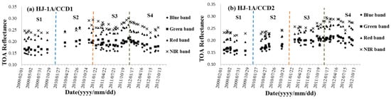 The same plots of the HJ-1/CCDs as the MODISs are presented in Figure 8. The temporal range of HJ-1/CCDs is 2009~2012 when the sensors are operational and in excellent condition. In Figure 8, it can be observed that the stability of the four CCDs is not as good as the MODIS for pronounced calibration drifts. The TOA reflectance of HJ-1/CCD varies periodically and the turning points are exactly the same as the calibration time, which is done once a year based on a vicarious calibration, thereby demonstrating that the procedure of the calibration may have some issues. However, as we have not involved the calibration, this is just an assumption.