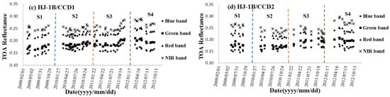 Time series of TOA reflectance of HJ-1/CCDs from 2008 to 2012 in reflective bands: (a) HJ-1A/CCD1; (b) HJ-1A/CCD2; (c) HJ-1B/CCD1; (d) HJ-1B/CCD2.