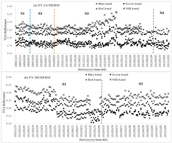 Time series of TOA reflectance of MERSIs in reflective bands: (a) FY-3A/MERSI from 2008 to 2015; (b) FY-3B/MERSI from 2010 to 2015.