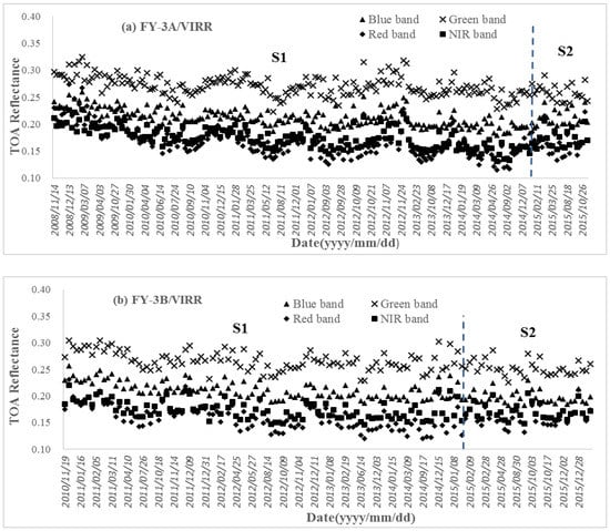 Time series of TOA reflectance of VIRRs in reflective bands: (a) FY-3A/VIRR from 2008 to 2015; (b) FY-3B/VIRR from 2010 to 2015. The color lines separate different calibration stages.